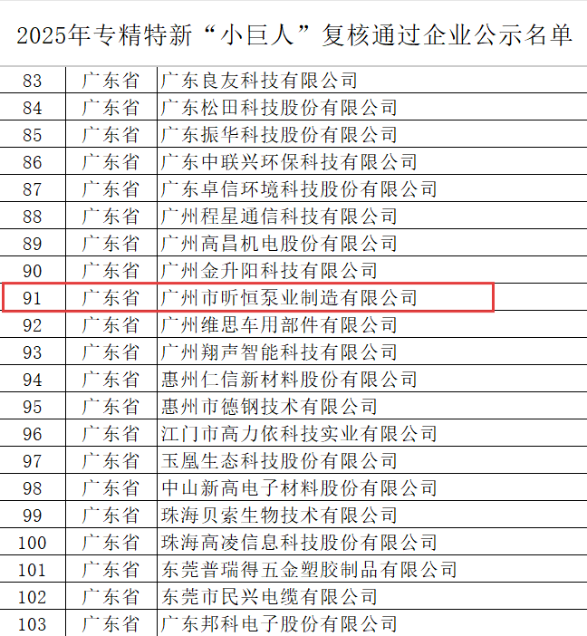 近日,国家工业和信息化部正式公示2025年专精特新“小巨人”复核通过企业名单。广州市昕恒泵业制造有限公司凭借在专业技术、市场应用及创新等方面的综合能力,成功通过复核。
